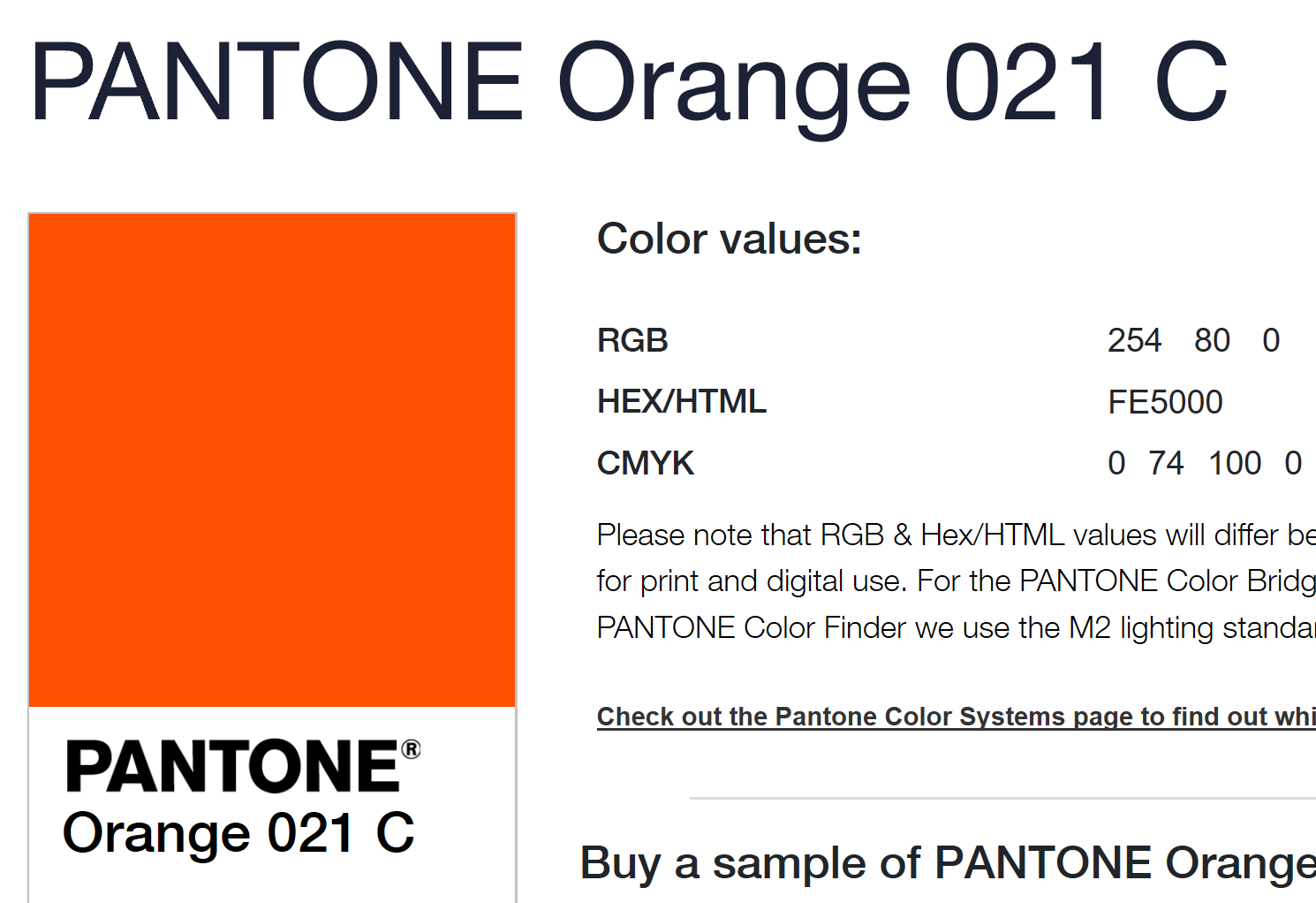 Pantone 021c cmyk. Use HEX color code for the web RGB and CMYK for Print and for other digital projects. For the PANTONE Color Bridge Guides we use the M1 lighting standard to align with industry standards for process printing. In the RGB color model fe5000 is comprised of 9961 red 3137 green and 0 blue.